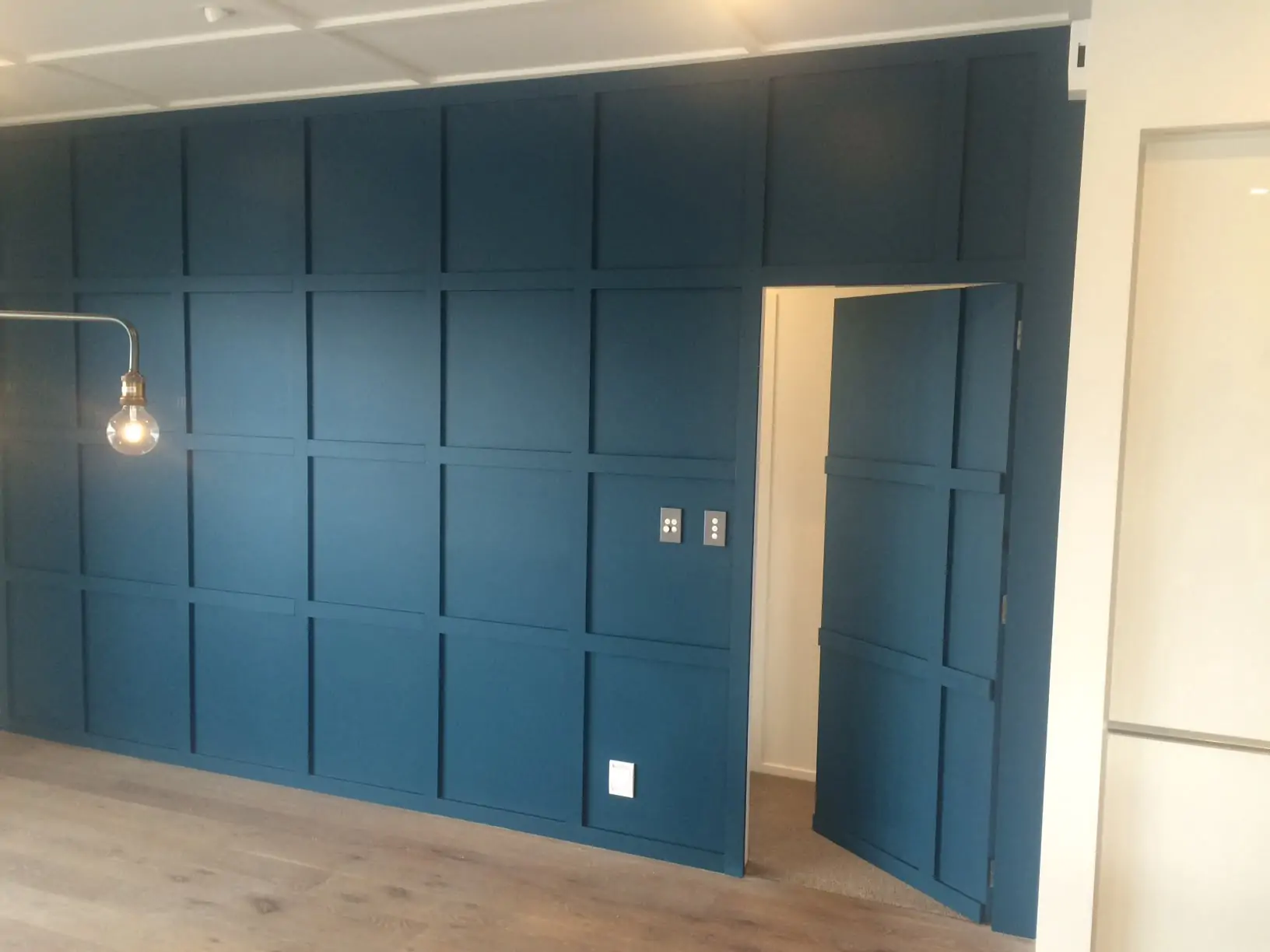 - Стінові панелі: Ефектний спосіб – покрити стіну та дверне полотно єдиними стіновими панелями (дерев’яними, МДФ, шпонованими, текстильними). У цьому випадку двері стають частиною великої декоративної композиції.