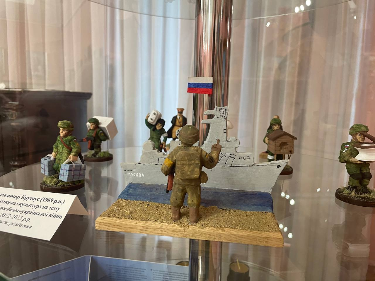 В колекції – фігурка мародера з пральною машиною, унітазом або з награбованими речами в пакеті. Є навіть фігурка вояка із собачою будкою. І, звичайно, є фігурка українського прикордонника, що вказує відомий напрямок для російського корабля.